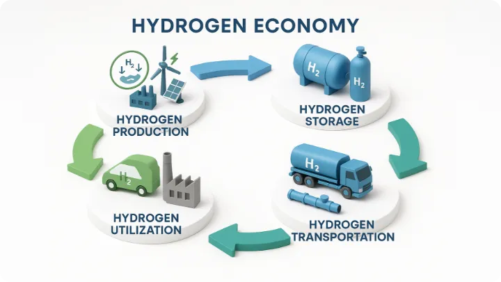 수소 생산 → 저장 → 운송 → 활용으로 이어지는 단계는